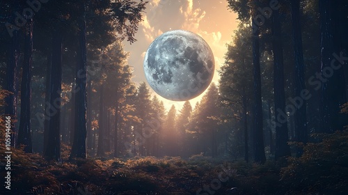 Naklejka premium Tranquil Alien Forest with Colossal Moon Casting Soft Glow over Surreal Landscape