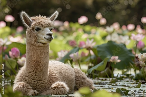 Obraz premium Tranquil alpaca lounges amidst blooming water lilies in a lush pond setting