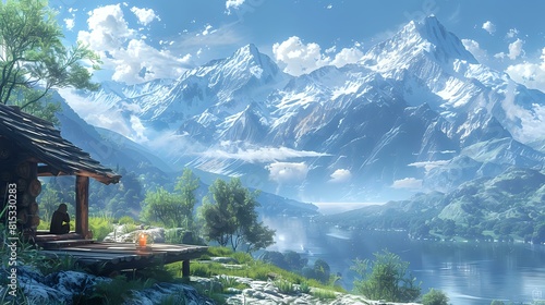 © Maquette Pro, Fototapeta premium Tranquil Alpine Cabin Retreat with Scenic Mountain View