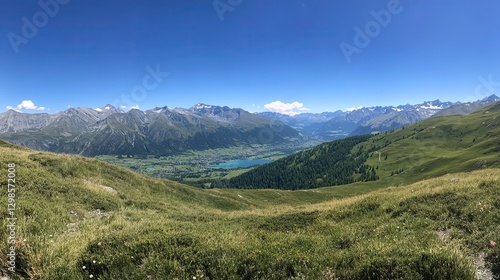 Naklejka premium Tranquil Alpine Lake with Grass-Covered Hills and Clear Blue Sky, Capturing the Essence of Summer in the Alps, Ideal for Travel and Nature-Themed Designs