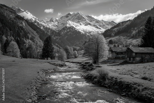 © Sheikh, Obraz premium Tranquil Alpine Valley: Snow-Capped Peaks Surrounding a Pristine River Through Green Meadows and a Quaint Chalet black and white