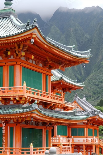 Fototapeta premium Tranquil ancient japanese temple nestled in misty mountains, a serene fantasy setting