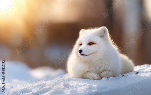 Naklejka premium Tranquil Arctic Fox Resting on Soft Snow in Icy Winter Landscape at Dusk