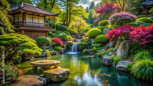 Obraz premium Tranquil Asian Garden Scene with Decorative Water Feature and Lush Greenery...