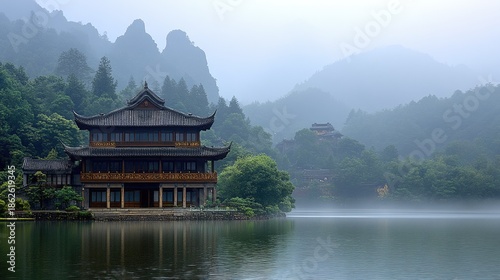 Fototapeta premium Tranquil asian temple by a misty lake.