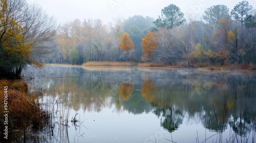 Fototapeta premium Tranquil Autumn Fog Over Lake.