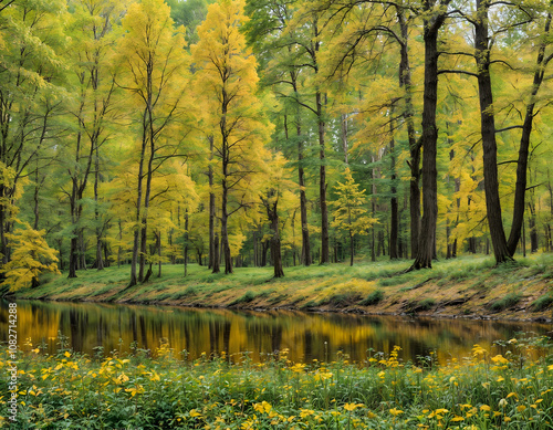 Fototapeta premium Tranquil autumn forest by a calm river with vibrant yellow foliage