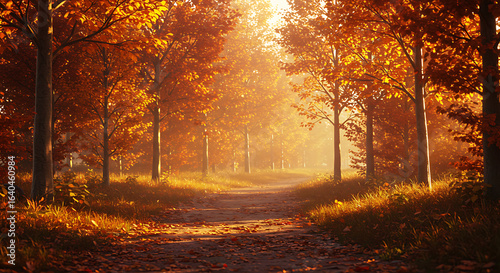Fototapeta premium Tranquil autumn forest pathway bathed in warm golden sunlight