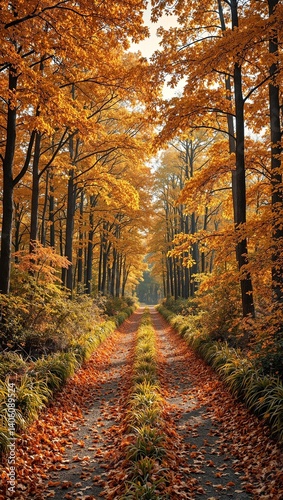 Fototapeta premium Tranquil autumn forest trail with colorful leaves and sunlight streaming through tall trees