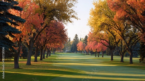 Fototapeta premium Tranquil Autumn Golf Course Landscape with Vibrant Fall Foliage and Serene...