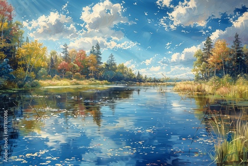Naklejka premium Tranquil Autumn Lake Scene With Sunlight and Birds in Flight