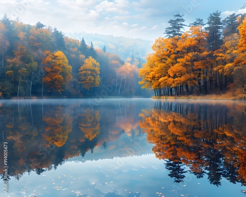 © Thares2020, Naklejka premium Tranquil Autumn Lake with Vibrant Reflected Trees and Calm Waters