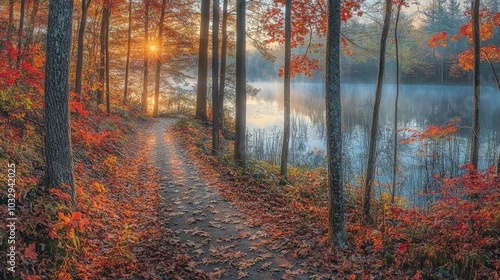 © Nuttaya Nampai, Fototapeta premium Tranquil Autumn Path by a Serene Lake