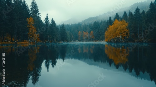 Fototapeta premium Tranquil Autumn Reflections in a Misty Forest Lake Surrounded by Vibrant...