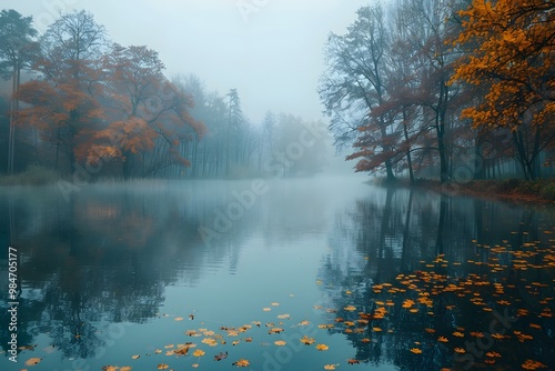 Naklejka premium Tranquil Autumn Reflections in a Misty Lake