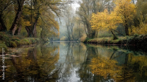 © Kitta Studio, Fototapeta premium Tranquil Autumn Riverbank with Vibrant Reflections and Trees