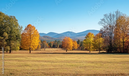 Naklejka premium Tranquil autumn view, open field, colorful trees, distant mountains