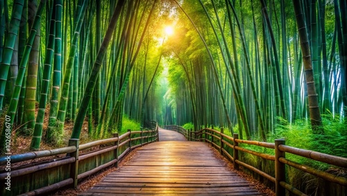 © prapatsorn, Obraz premium Tranquil Bamboo Forest Pathway Surrounded by Lush Greenery for Nature Lovers and Serenity Seekers in a Peaceful