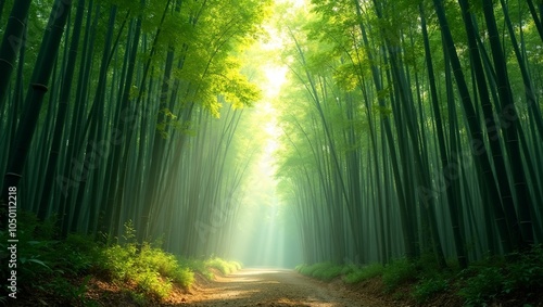 Obraz premium Tranquil bamboo forest with dappled sunlight