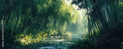Fototapeta premium Tranquil bamboo forest with sunlight and calm river