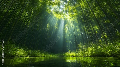 © faiz, Fototapeta premium Tranquil Bamboo Forest with Sunlight Filtering Through Canopy