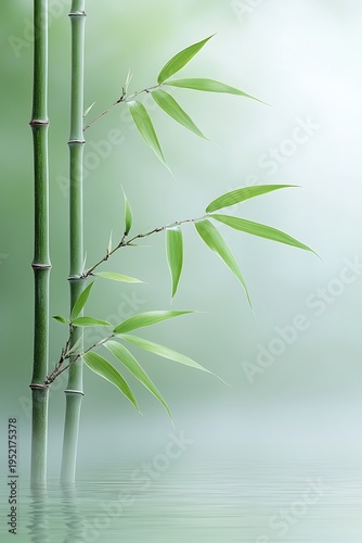 © NadenDesign, Naklejka premium Tranquil bamboo stalks with delicate green leaves in serene water environment