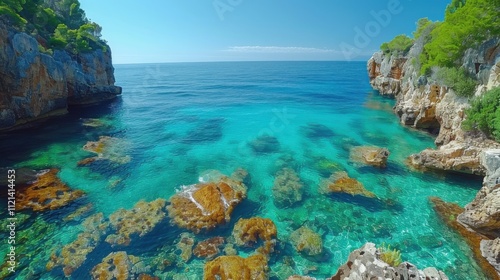 © Rashidi, Fototapeta premium Tranquil Bay Surrounded by Tall Cliffs and Clear Waters
