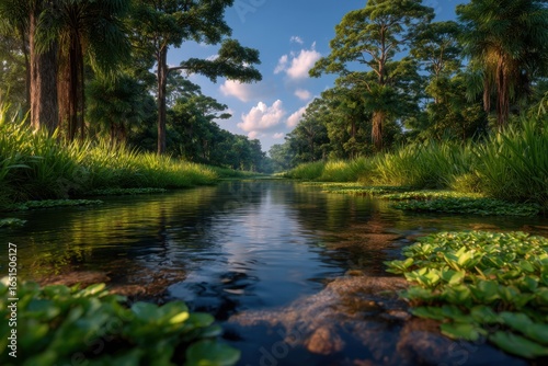 © STOCK AI, Naklejka premium Tranquil Bayou Landscape with Lush Greenery and Calm Water Under a Blue Sky