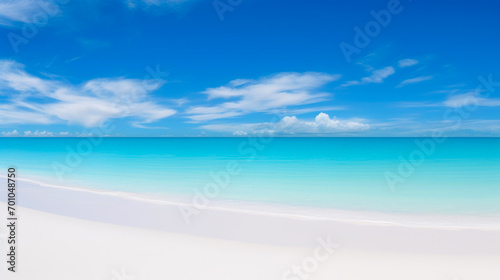 © Andrii , Fototapeta premium Tranquil Beach Haven: A Panoramic Symphony in Navy and White