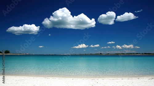 © Robet, Fototapeta premium Tranquil Beach Scene: Azure Waters, Fluffy Clouds, and White Sand.