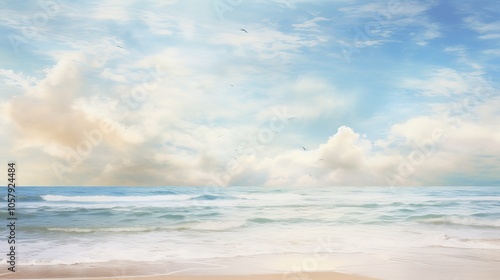 Fototapeta premium Tranquil beach scene with a gentle sea and soft clouds.