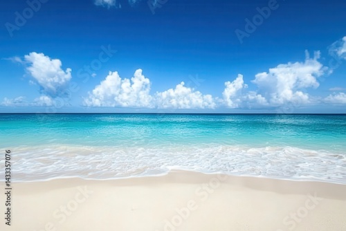 © Agent Neptunus, Fototapeta premium Tranquil beach scene with azure water and fluffy clouds.