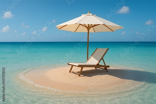 © Smile Photo, Obraz premium Tranquil Beach Scene with Lounge Chair and Umbrella under Blue Sky