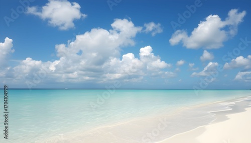 Fototapeta premium Tranquil beach scene with pristine white sand and turquoise water under a bright blue sky with fluffy clouds.