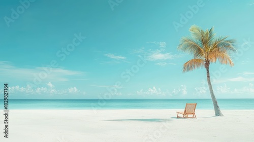 Fototapeta premium Tranquil Beach Scene with Single Palm Tree and Chair