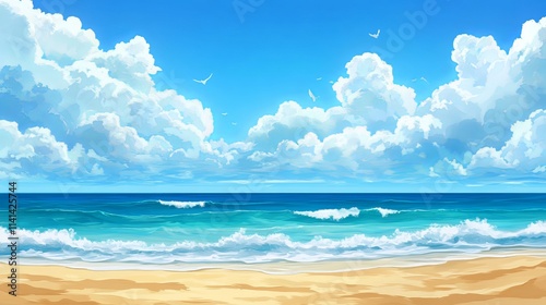 © Nazia, Obraz premium Tranquil beach scene with soft sand, calm sea, and clear blue sk