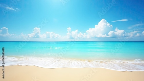 © Percetakan, Fototapeta premium Tranquil beach scene with turquoise water and white clouds.