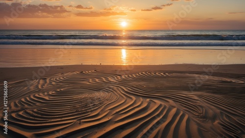© The 2R Artificiality, Naklejka premium Tranquil Beach Sunset With Detailed Sand Patterns Reflecting Warm Golden Light