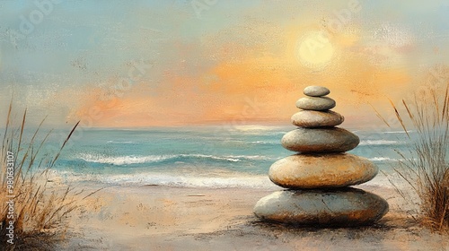 © Hailie, Fototapeta premium Tranquil Beach Sunset with Stacked Stones