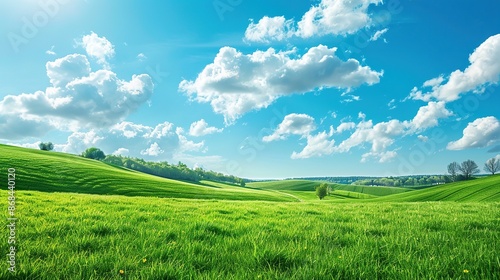 Fototapeta premium Tranquil beauty of springtime nature in peaceful countryside landscape. Green grass, blue sky, white clouds, rolling hills. copy space for text.