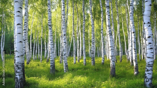 © Noppakun, Obraz premium Tranquil Birch Grove Surrounded by Lush Greenery