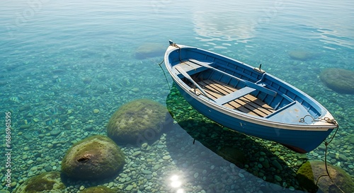 Obraz premium Tranquil Blue Boat in Crystal-Clear Shallow Water