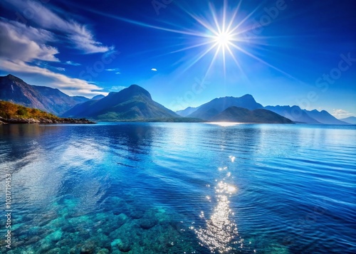 © Four888, Obraz premium Tranquil Blue Sea with Majestic Mountains and Sunlit Waves - Nature Photography