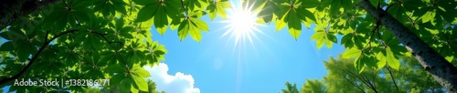 © Naksit, Fototapeta premium Tranquil blue sky peeking through sun-dappled leaves in forest, sunlit, forest