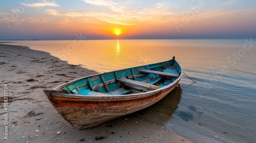 © Lonely, Fototapeta premium Tranquil Boat on Serene Beach