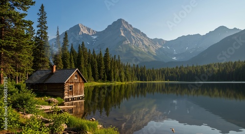 Fototapeta premium Tranquil Cabin by Still Waters: A Serene Landscape of Pine Trees and Majestic...