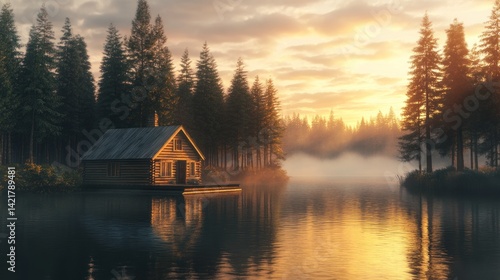 © avila, Fototapeta premium Tranquil cabin nestled on a serene lake at sunset, surrounded by a misty forest