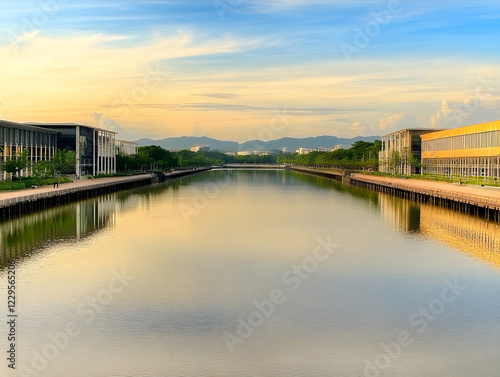 Obraz premium Tranquil Canal Reflects Golden Sunset and Modern Buildings with Distant...