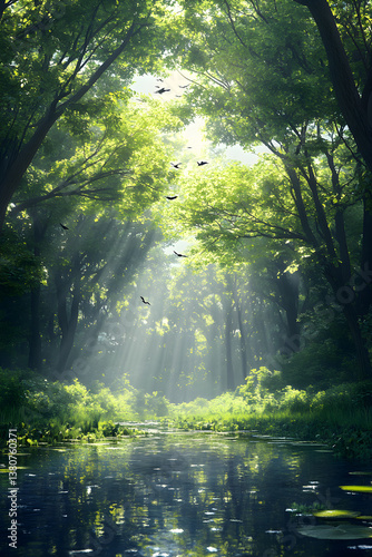 © Hettie, Fototapeta premium Tranquil Cascade: Sunlit Stream and Forest Symphony in Harmony