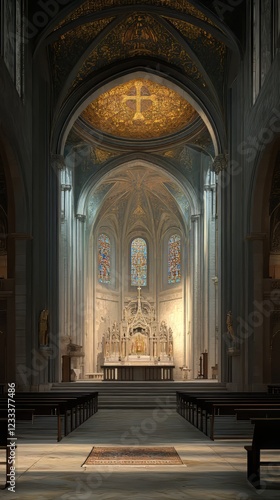 © KOOLAIDMAN100X, Fototapeta premium Tranquil church interior, bathed in light.
